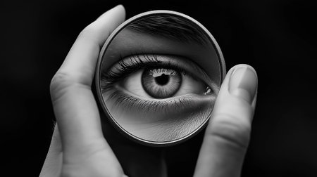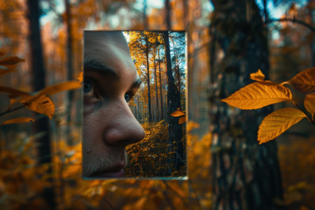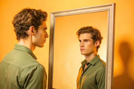 Male figure is looking into a round mirror, capturing a moment of reflection and self-discovery, with warm tones enhancing the emotional depth of the scene, AI generated