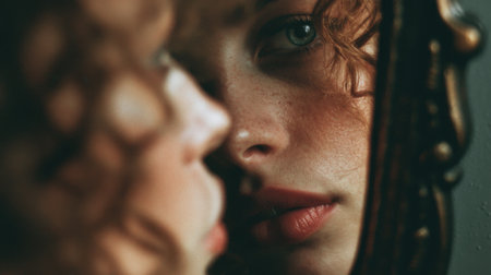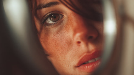 This close-up portrait captures a young woman's natural beauty and freckles as she gazes thoughtfully into a mirror, revealing her emotions in soft, warm light.