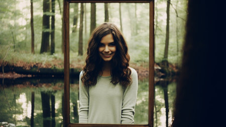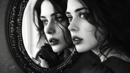 Generative AI : face of young beautiful healthy woman and reflection in the mirror