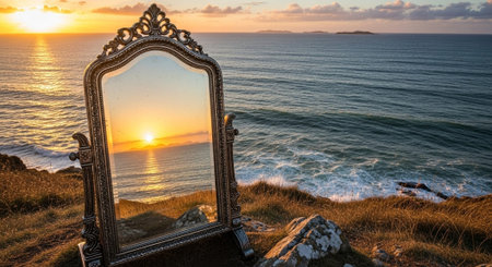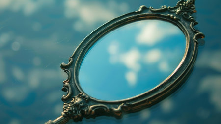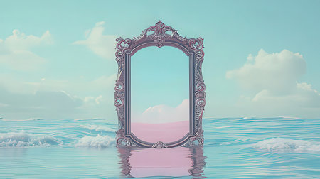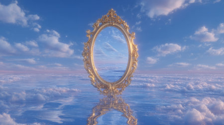 Gold-framed mirror sinking into a blue abyss reflecting the sky. Generative AI