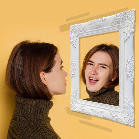 Young girl looking at mirror isolated on light background. Contemporary art collage. Concept of emotions, inner world, mental health