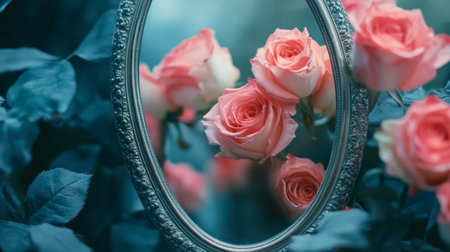 A close-up of a mirror reflecting a bouquet of roses, enhancing the beauty of the flowers.