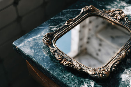 Small, rectangular mirror with a decorative gold frame is situated on a teal-colored marble surface. The mirror's reflection shows the surroundings, adding depth to the image. The frame's intricate details and the marble's veining are visible.