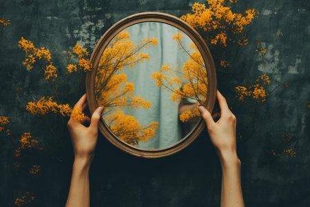 Reflecting Natures Beauty: A Hand Holding a Mirror with a Radiant Reflection of Yellow Flowers --ar