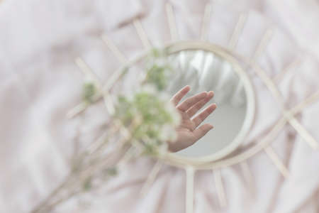 Hand reflected in mirror on background of soft fabric with manuka flowers. Spring aesthetics. Mental Health concept. Gentle image. Eye shape boho mirror. Happy Womens and mothers day