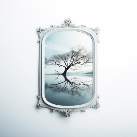 the mirror stands alone against a simplistic white background, its sleek reflective surface capturing the subtle nuances of light, creating a sense of serenity and calmness, perfect for interior design inspiration or minimalist photography enthusiasts. ai generated