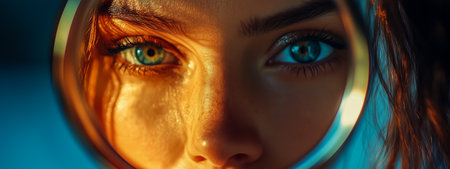 A close-up of a woman's striking eyes reflecting light and colors in a captivating way