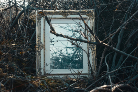 A white frame is sitting in the middle of a forest. The frame is empty and the branches of the trees are surrounding it. Scene is eerie and mysterious