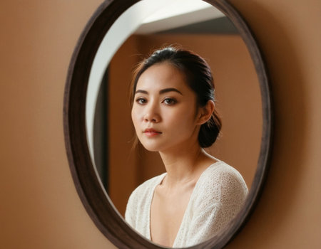 Image of a young Asian woman looking into an oval mirror. AI generation