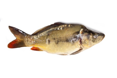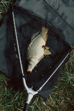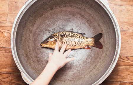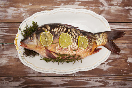 Fishing catch. The Common Carp, Cyprinus Carpio. In Central Europe, fish is a traditional part of a Christmas Eve dinner. With fishing rod