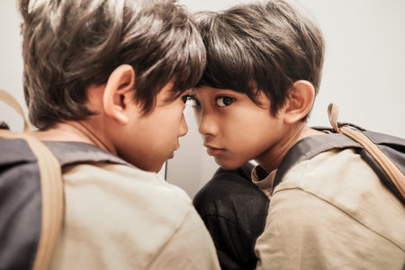 A Southeast Asian Boy Sitting in Front of a Mirror with Bored Expression and Eyes Staring