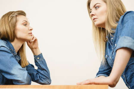 Two women having argue mocking up being mad at each other. Female telling off, ignorance concept.