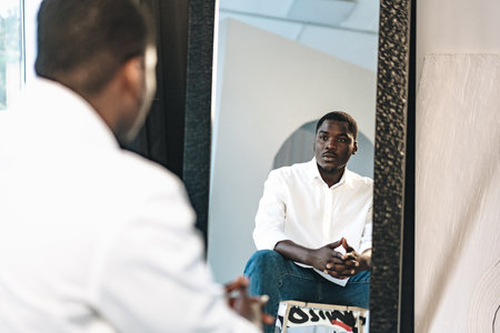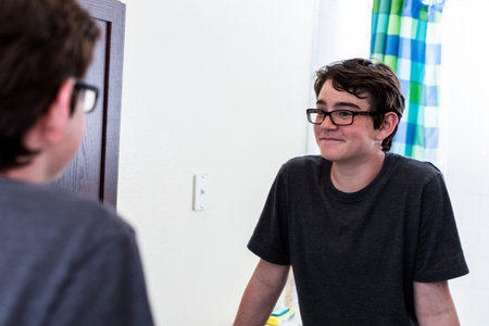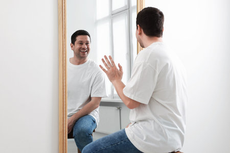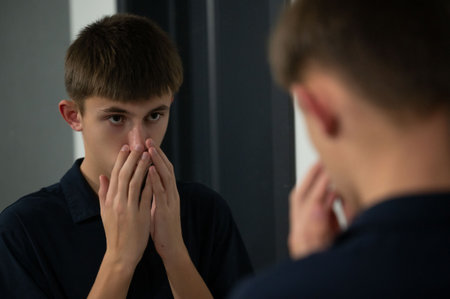 A young individual stands in front of a mirror, pressing fingers to their mouth, lost in thought, conveying a sense of introspection and emotional depth in a calm environment.