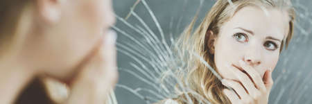 Beautiful redhead girl with long hair and blue eyes looking at herself in a broken mirror