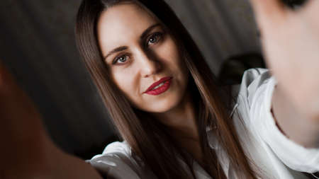 Self portrait of woman with red lips shooting selfie on front camera with two hands