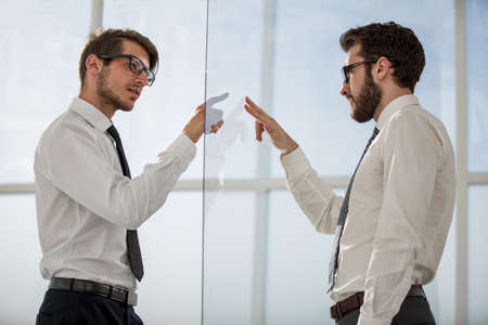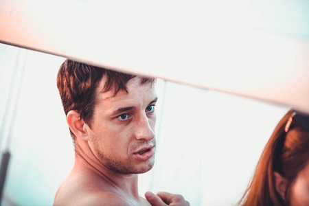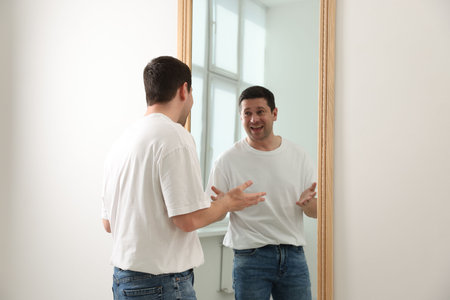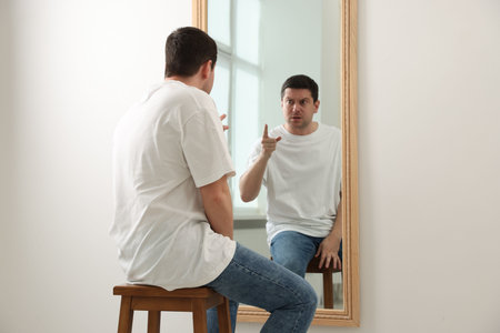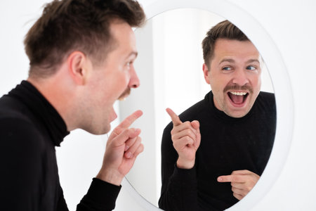 Man looking in mirror in anger and rage and shouting at him self. Psychological problem concept
