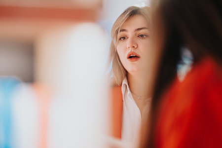 Young woman browses a bright bookstore shelf, focused and curious as she selects a book