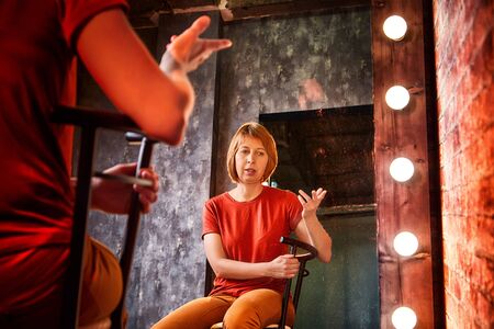 Girl in red shirt on a tall chair in front of a lighted mirror in a dark room. Model posing for a cam during photoshoot in the Studio