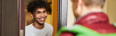 Its pizza time. Young guy looking happy while meeting courier with pizza box, spending time at home alone