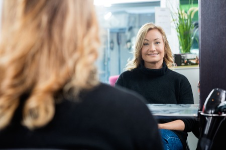 Sensual low key boudoir portrait of seductive female gazing on her mirror reflection as she ruffling hair. Human emotion or fashion concept image.