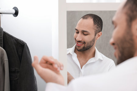 Photo of focused unshaven man wearing striped shirt looking at himself in mirror indoors