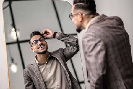 The guy with the rare beard looks in the bathroom mirror in a touched way