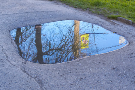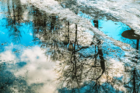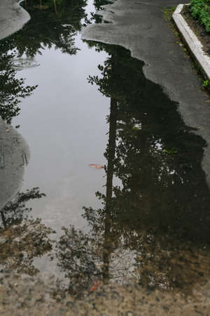 concept Bad weather, Puddle on the street with a reflection of the tree