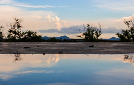 A serene scene of a shallow puddle reflecting fluffy clouds in a sandy area. The tranquil moment captures the beauty of nature, evoking feelings of peace and calm.