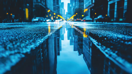 A captivating urban scene showcasing the reflection of skyscrapers in a puddle on a rainy street. Dramatic clouds enhance the moody city environment.