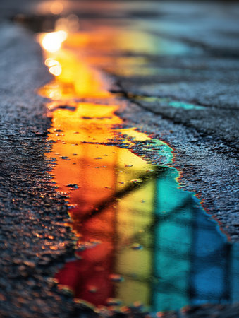 A vibrant display of colors reflected in an oil puddle on asphalt captures the beauty of light refraction in a close-up view during sunset.
