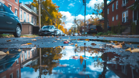 A quiet urban street showcases reflections in puddles after rainfall, surrounded by charming homes. The scene captures nature's beauty in a tranquil environment.