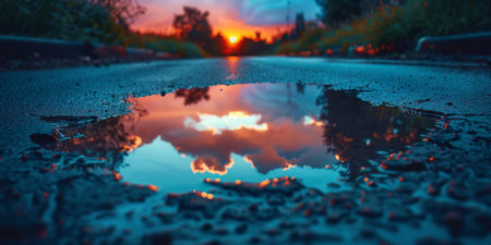 An overhead shot shows a puddle on an asphalt road reflecting the vibrant colors of a sunset and the silhouette of a tree. The composition highlights the water's smooth texture against the textured road. The warm colors contrast with the cool tones of the sky. This image is suitable for various commercial uses.