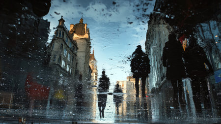 A reflection of a rainy street scene in a large puddle, showing buildings and people.