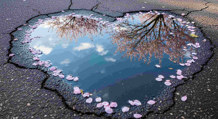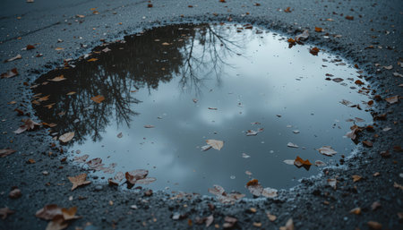 Water collects in a puddle on the asphalt, displaying fallen leaves and tree reflections in a tranquil setting.