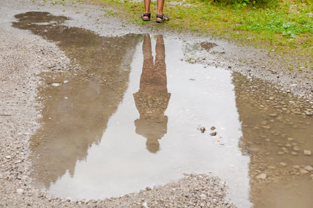 reflection of person in puddle. puddle outside. Person stands on wet road. Feet on asphalt.