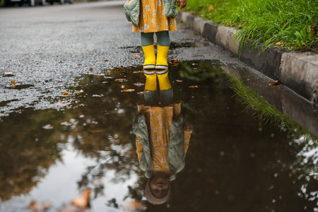 Little girl wearing yellow rubber boots standing in puddle outdoors, closeup