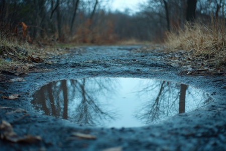 Water collects in a puddle along a dirt path, reflecting bare trees and overcast skies, creating a tranquil atmosphere in the early morning light of a forest.