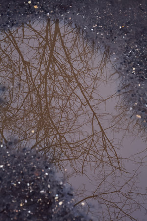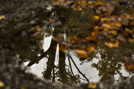 Reflection of trees in the puddle. Autumn landscape. Selective focus
