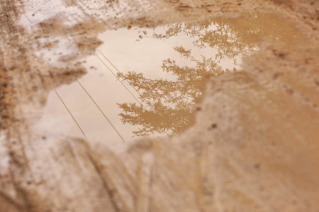 Water reflecting a tree and power lines in a puddle on a dirt road, creating a serene and tranquil atmosphere in nature