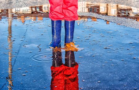 legs of little girl in blue boots and red pants standing in a pool with fallen yellow leaves on autumn day closeup