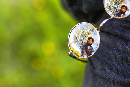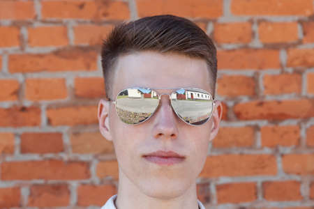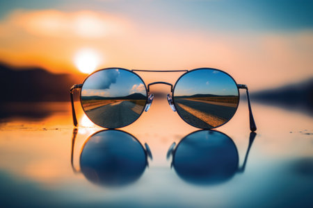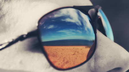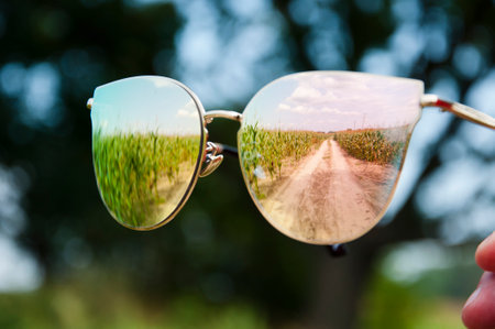 sunglasses with reflection of field and road way. summer vacation outdoor. summer reflective eyeglasses or mirror glasses. selective focus of stylish accessory.