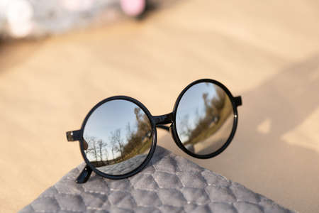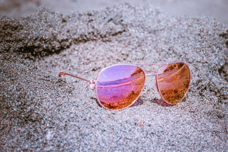Round sunglasses with mirror reflection on the sand on sunny summer beach. Travel vacations concept.