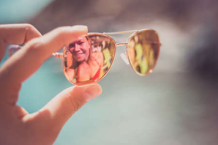 Sunglasses in female hand at the beach with herself reflection. Holidays, travel, vacation and happiness concept.