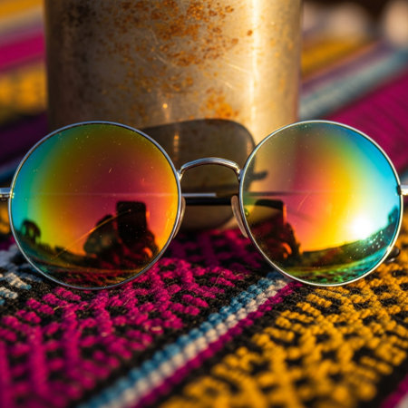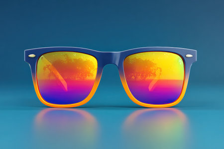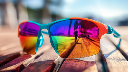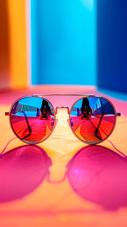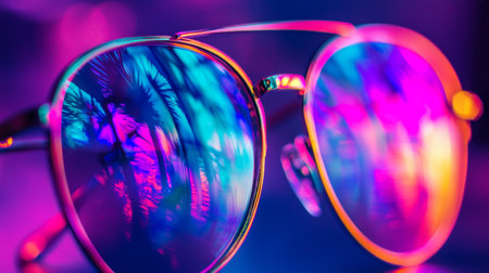 Close-up of colorful sunglasses with vibrant reflections of tropical scenery, creating a bold and trendy summer aesthetic.