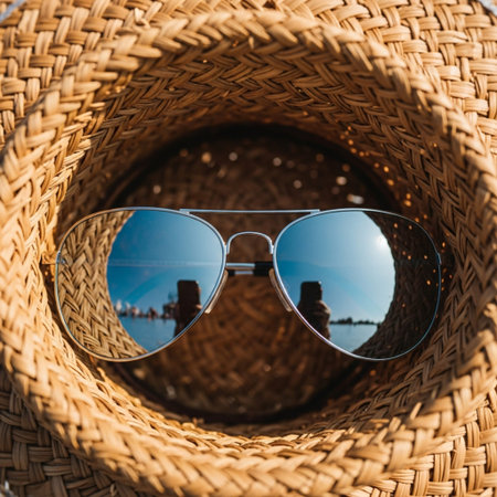 Sunglasses reflect a stunning sunset over the ocean, capturing vibrant colors as the sun sinks below the horizon, creating a tranquil atmosphere.