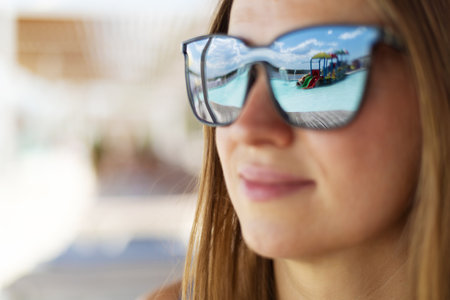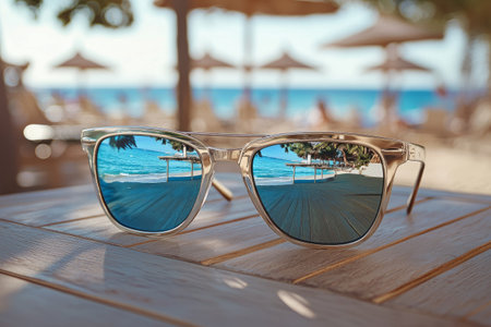 Close-up of sunglasses reflecting a serene tropical beach scene, with palm trees swaying under a bright blue sky and warm sunlight, evoking a sense of relaxation.