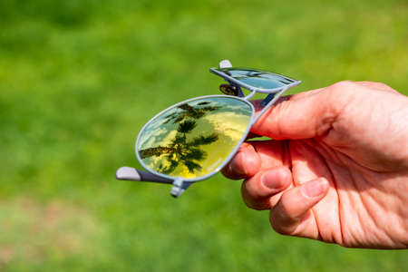 Sunglasses reflect a palm fringed resort and sea. Concept of holiday mood