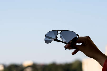 Fashion cat eye sunglasses model for women hold in hand shoot outside in a summer day closeup. Selective focus