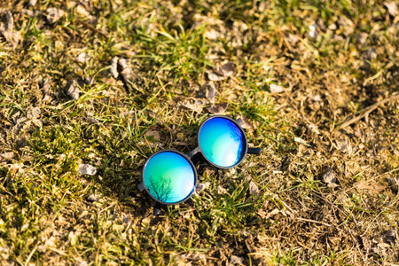 Sunglasses with big blue round lens shoot outdoors in a sunny day