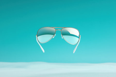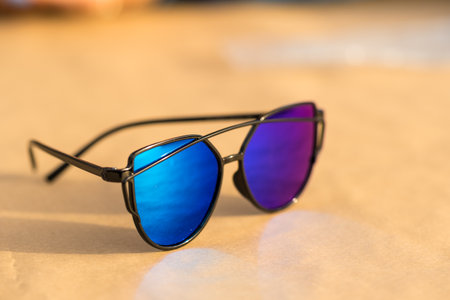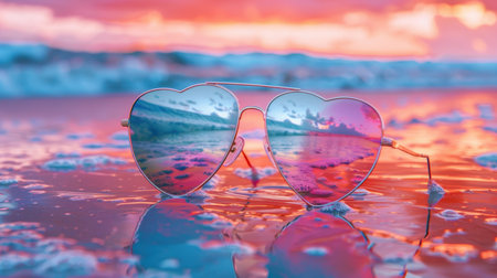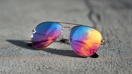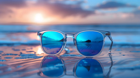 A captivating scene features stylish sunglasses with reflective lenses resting on warm golden sand under the bright sun, perfect for summer vibes.